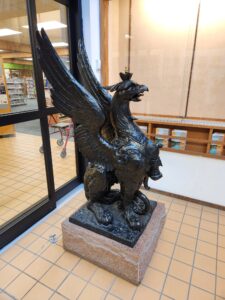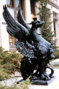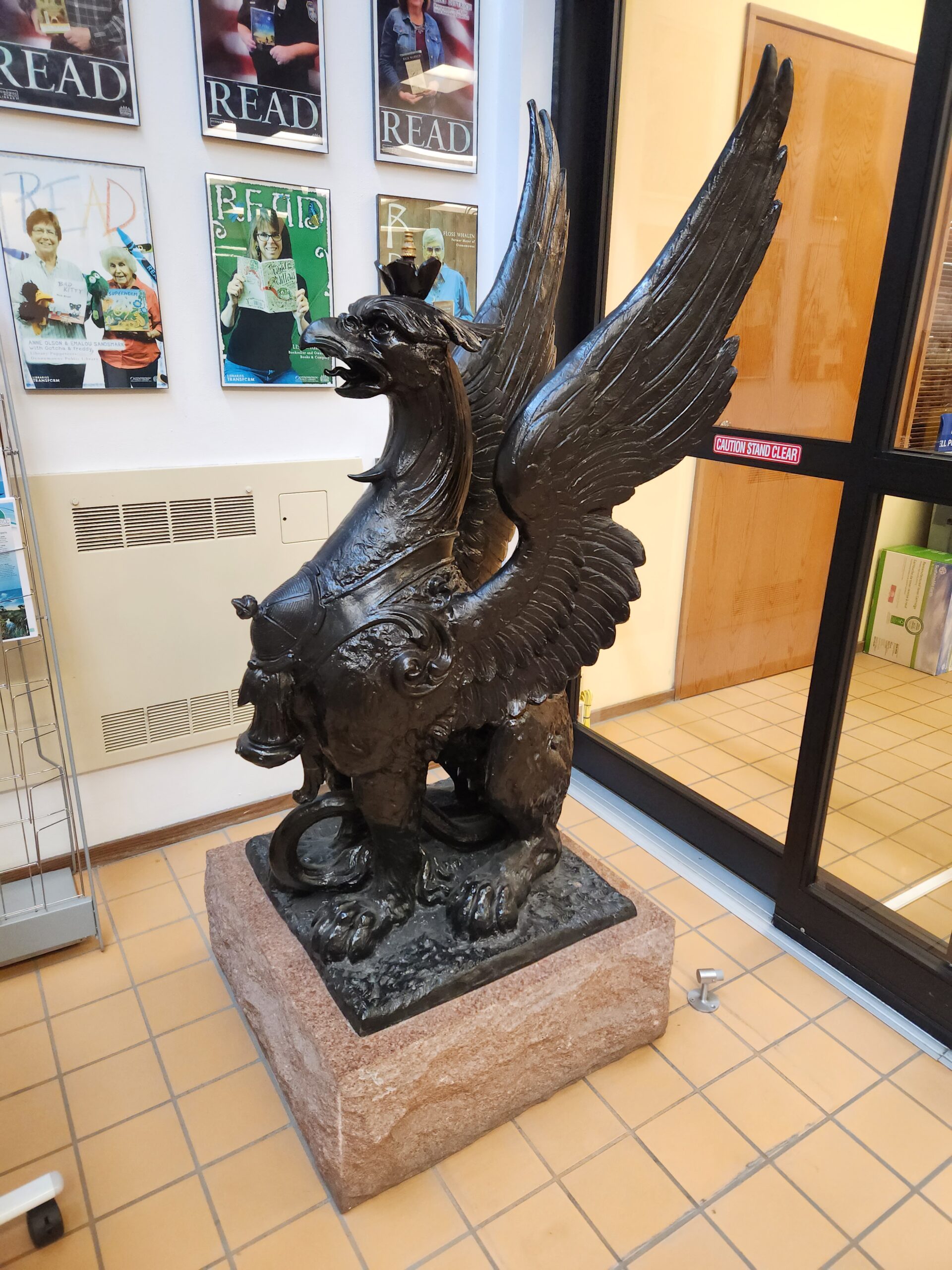 The most visible and oldest pieces in the Library’s collection of artwork are our griffins, Poseidon and Athena. Griffins are mythological creatures, half eagle and half lion. They are said to guard precious treasures, which is why we feel they are perfect guardians and symbols of our library.